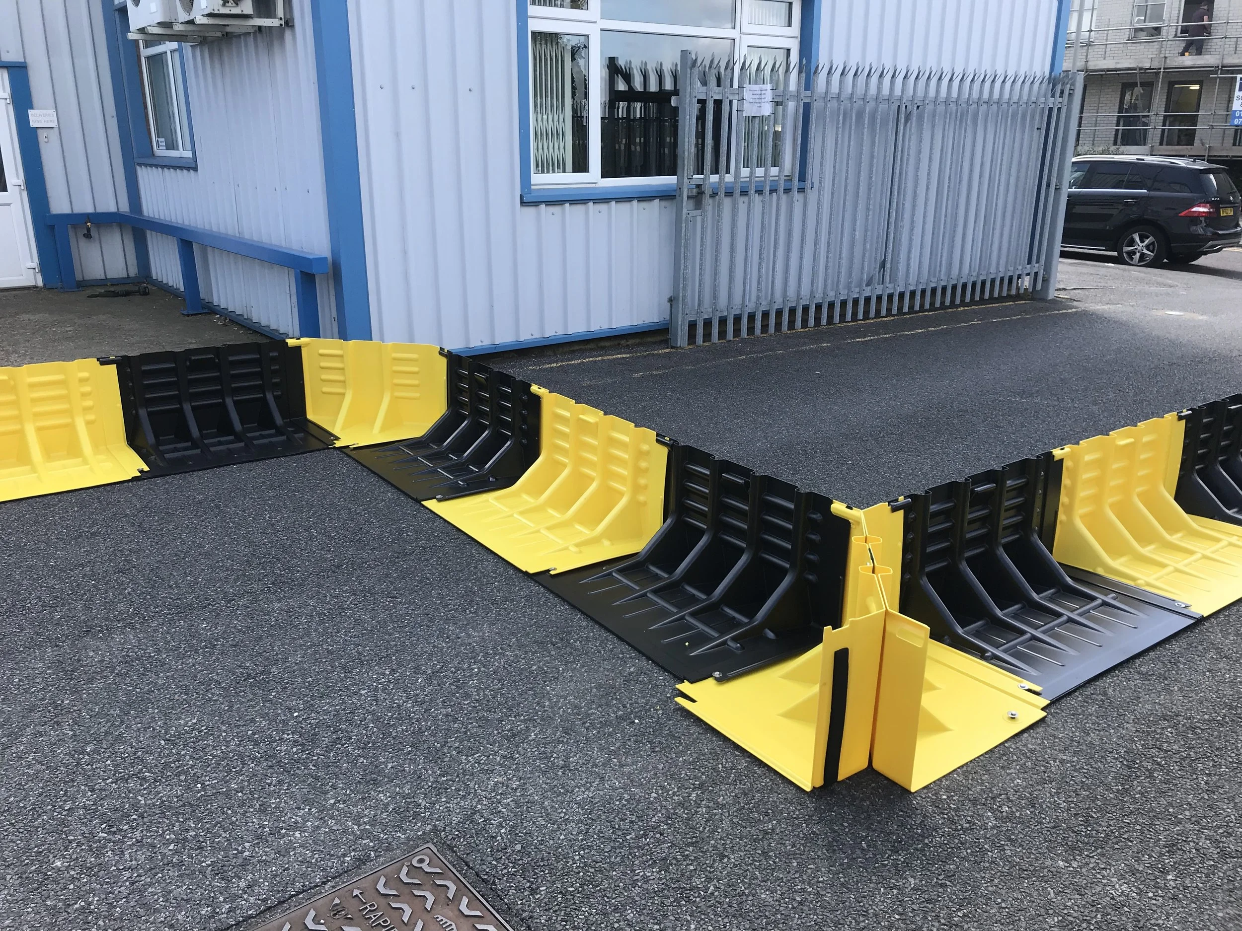 Each unit incorporates a slim line base gasket allowing sealing to the ground terrain. Use is recommended on hard-standings. This system is ideal for controlling flowing water, for example diverting or deflecting damaging water flows to where you want them. Uses include for burst water mains and control of surface water run off.